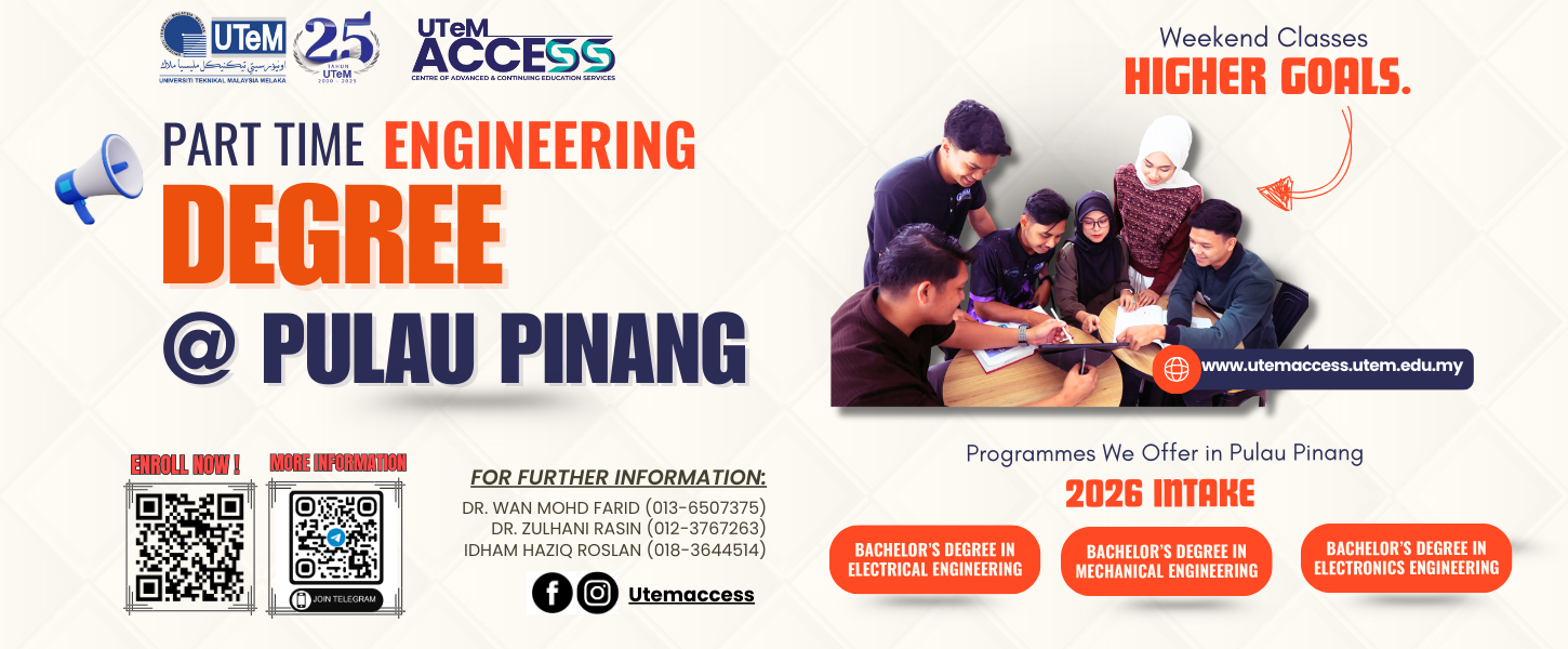 The UTeM ACCESS Part-Time Programme offers working professionals a flexible way to upgrade their skills and qualifications without leaving the workforce. Aligned with Malaysia’s high-income economic vision, it provides industry-relevant learning in Engineering, Engineering Technology, Computer Science, Technopreneurship and Technology Managment