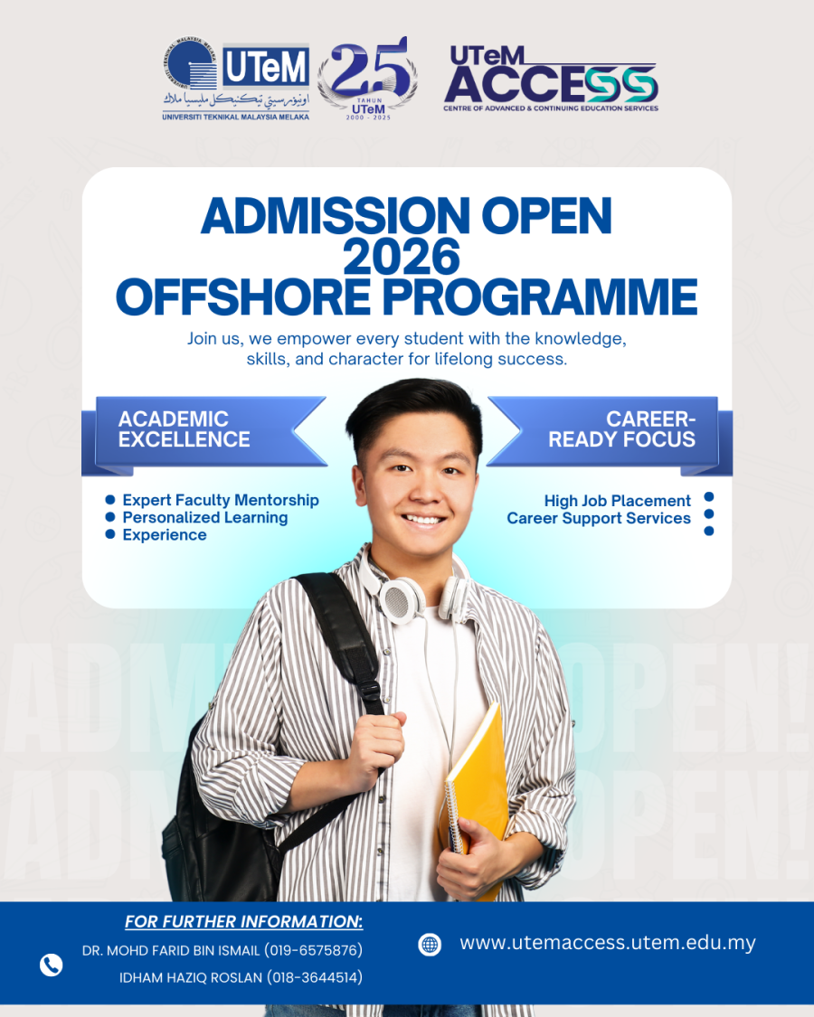 The UTeM ACCESS Open Access Programme provides an alternative pathway for individuals to pursue a full-time degree at UTeM on a self-funded basis. Designed for those who may not be eligible for government subsidies, this programme ensures that higher education remains accessible to a wider range of learners.