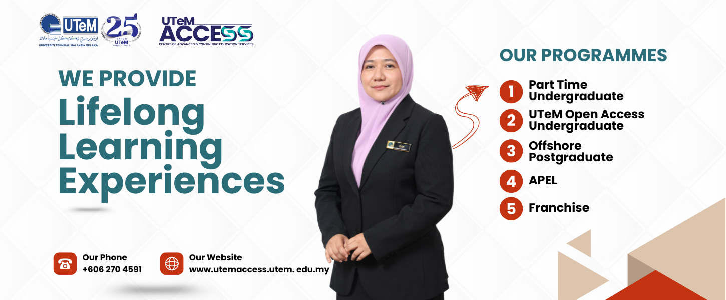 The Accreditation of Prior Experiential Learning (APEL) programme at UTeM ACCESS offers an alternative pathway into higher education by recognising an individual’s prior learning whether gained through work experience, training, or informal learning. APEL provides opportunities for those without the traditional academic qualifications to pursue diploma, bachelor’s, or postgraduate studies.